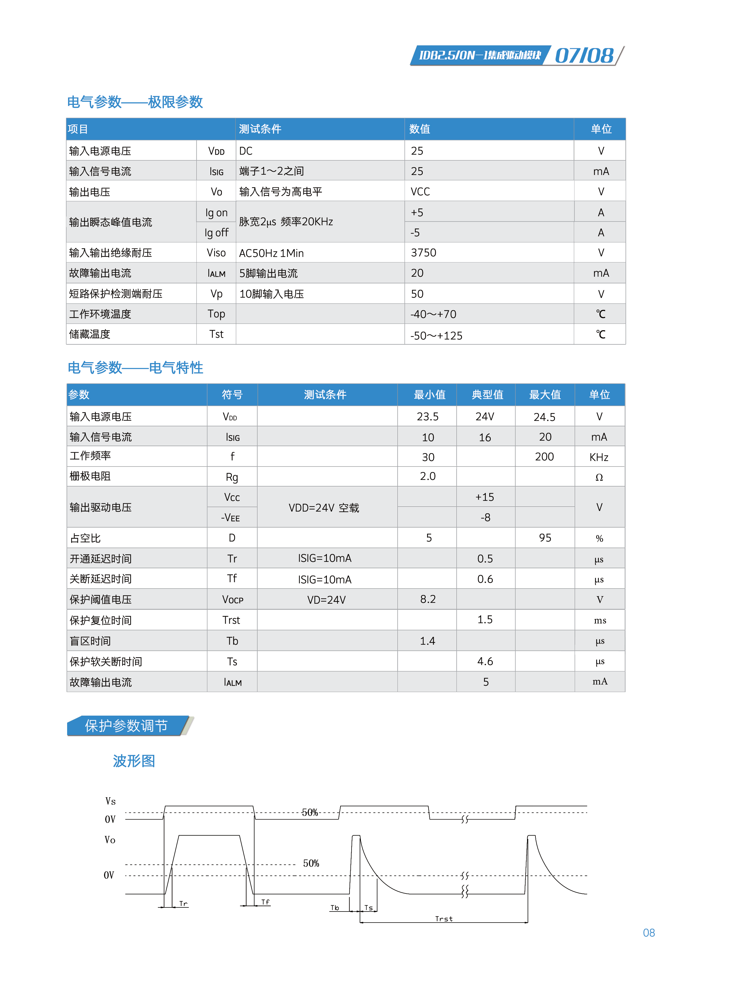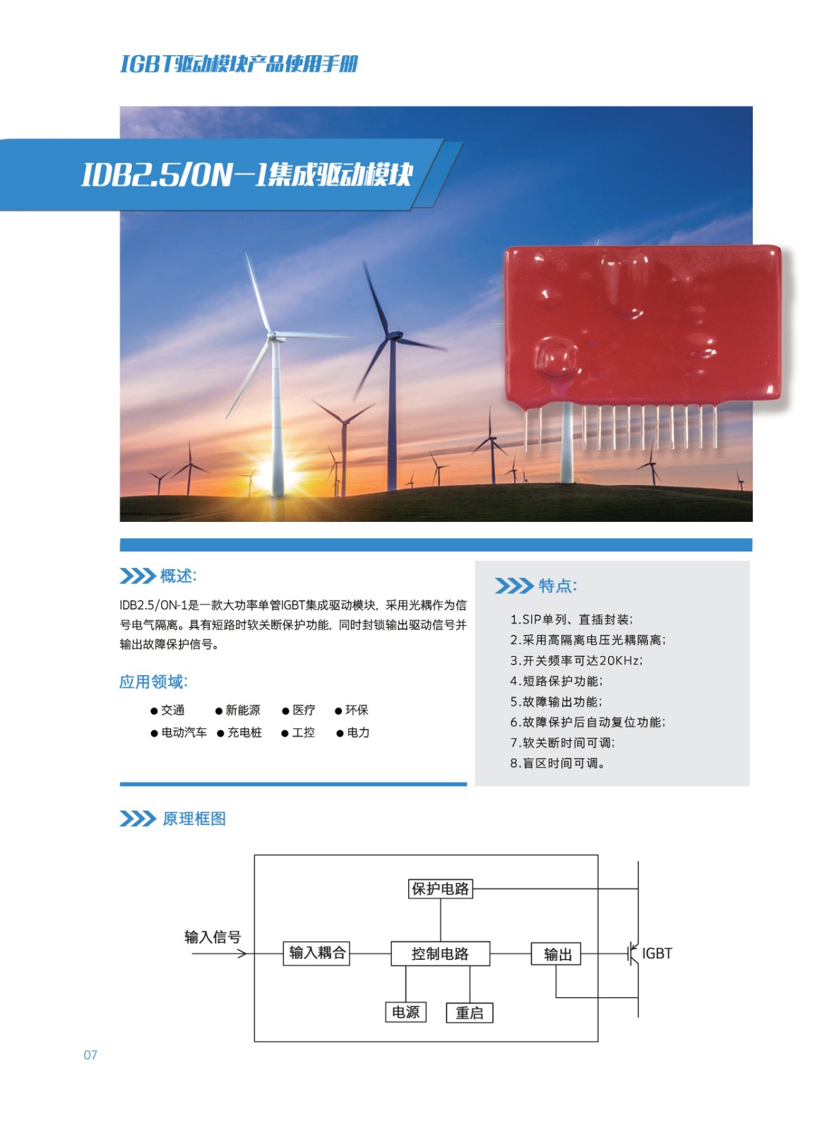 IDB2.5/ON-1是一款大功率單管IGBT集成驅動模塊,采用光耦作為信號電氣隔離。具有短路時軟關斷保護功能,同時封鎖輸出驅動信號并輸出故障保護信號。